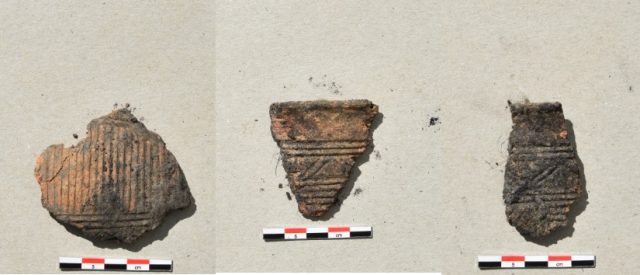 Tre biter keramikk. Keramikken har tydelig kam-dekor.