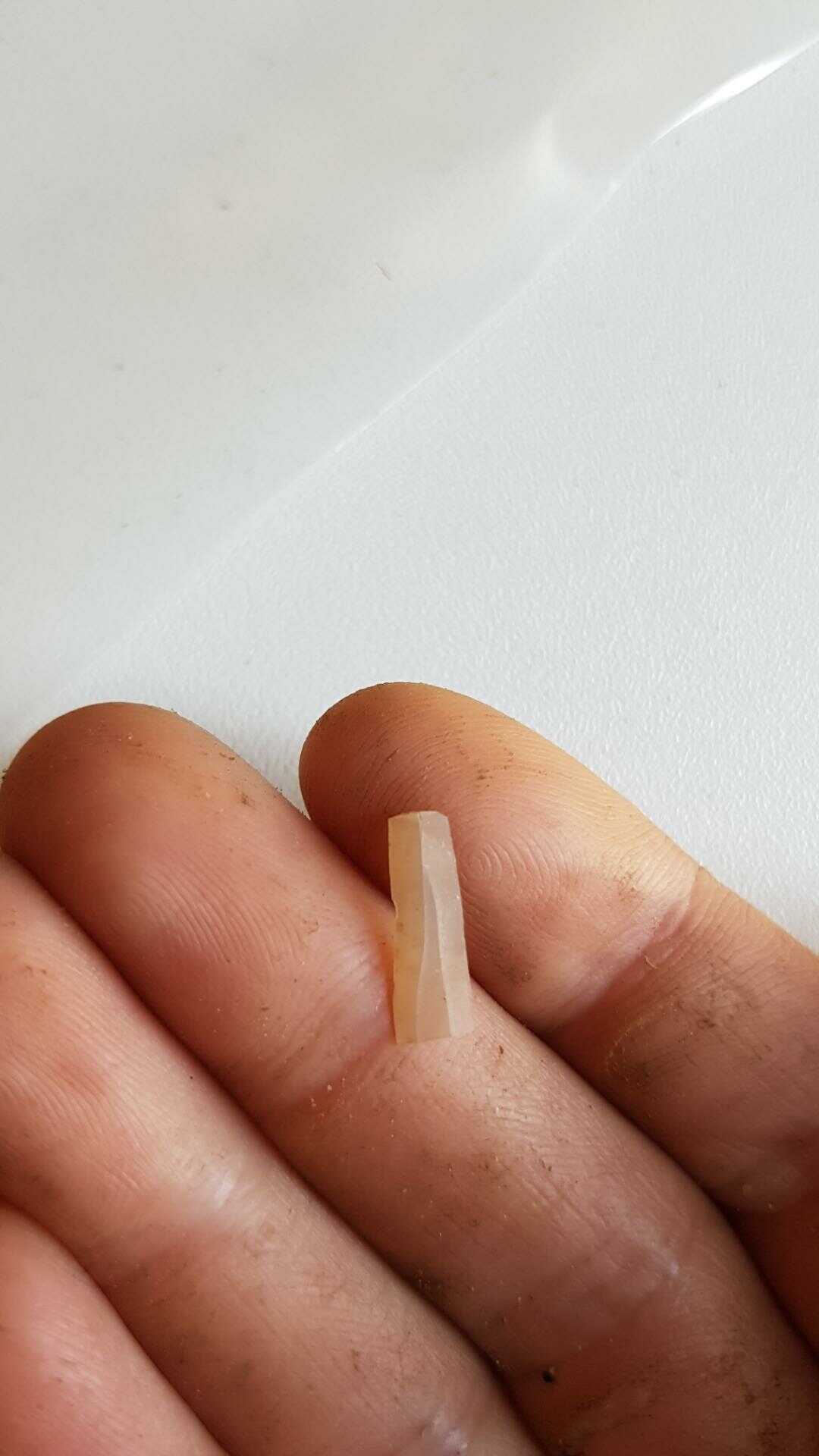 Så langt har vi gjort et ca. 200 flintfunn, hvorav 95 % er avslag (rester etter produksjon av redskaper). Av redskap har vi funnet 2-3 mikroflekker (Bilde 3), fragment av flintkjerner samt to runde stein som trolig er blitt brukt til å slå av flintavslag fra kjernen.